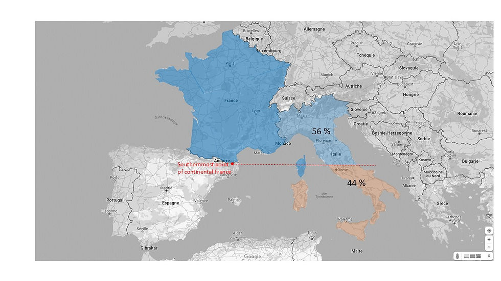 Même du point de vue des latitudes, est est donc faux d'affirmer, comme on tend à le penser naturellement, qu'il existerait une proximité particulière entre l’Espagne et l’Italie, et que la France serait fondamentalement "à part".